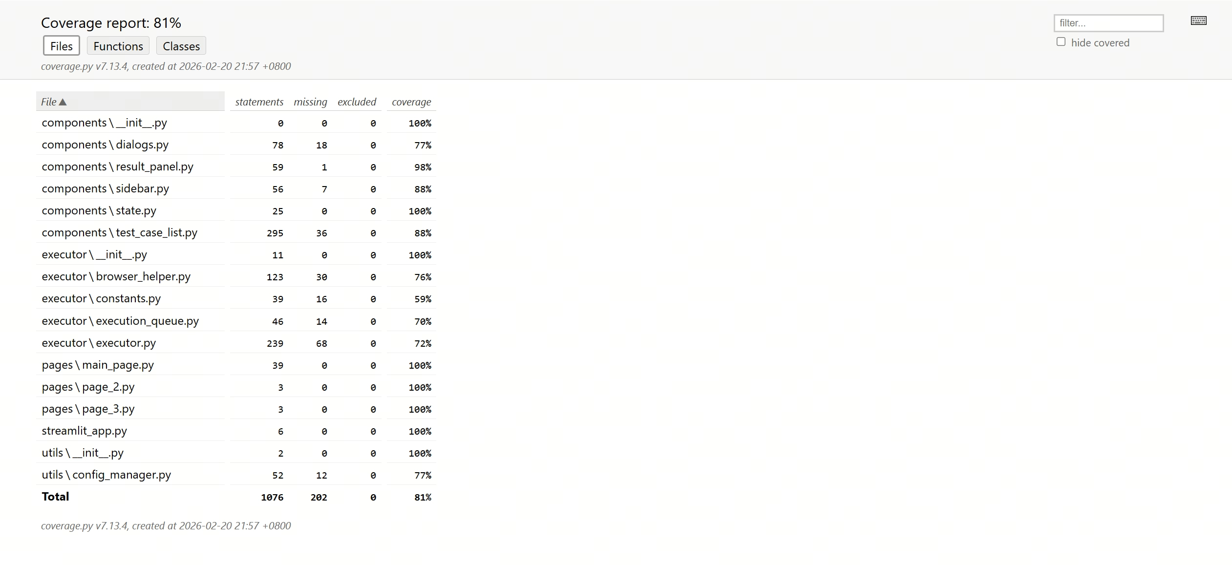 报告里会列出每个文件、类、函数的行覆盖率详情:
